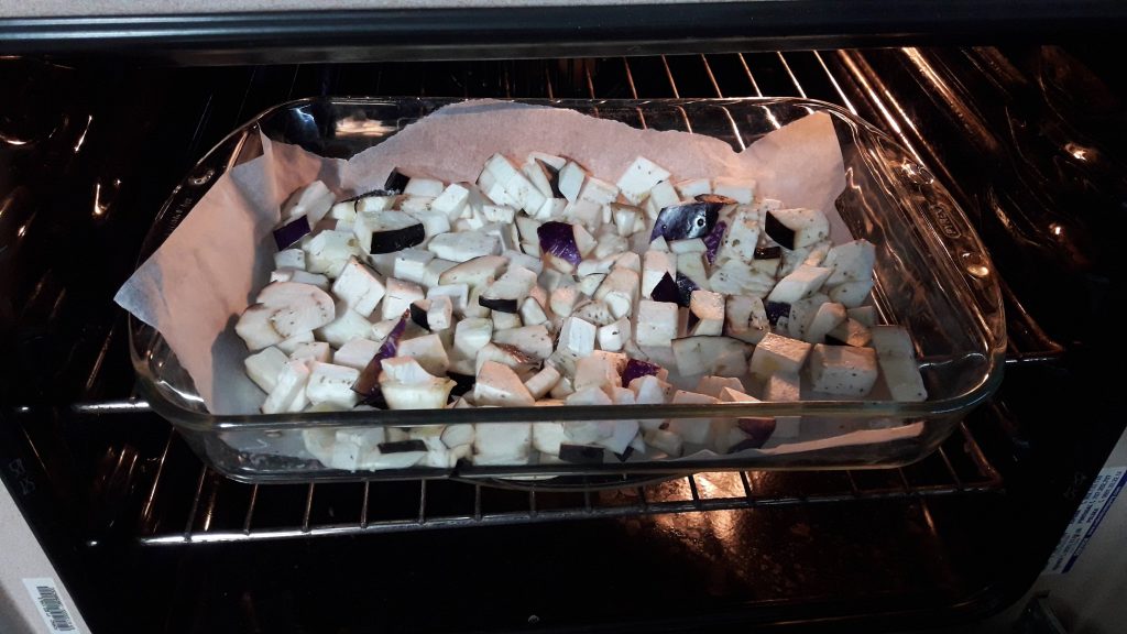 • Zuerst schneiden wir die Aubergine mit Schale in Würfel, legen sie auf ein Backblech mit Backpapier und würzen sie mit Salz, Pfeffer, Oregano und Olivenöl.