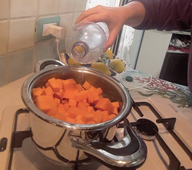 zum Schluss die Kürbiswürfel. Würze mit Salz und gieße etwa 300 ml Wasser oder Brühe ein.