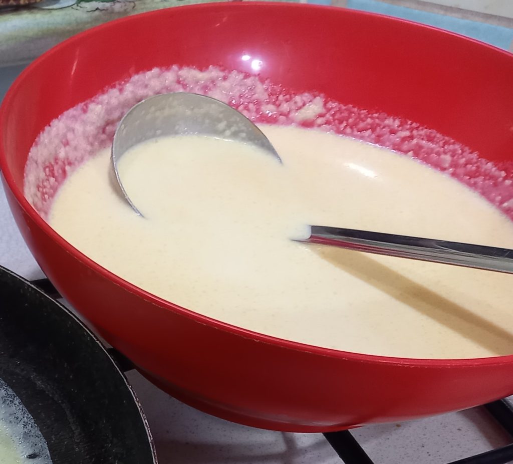 Geben Sie Butter in einen Topf und schmelzen Sie sie. Fügen Sie Milch, Mehl, Eier und Salz hinzu, mischen Sie mit den elektrischen Schneebesen, bis die Mischung glatt und homogen ist. Der Teig sollte die Konsistenz einer flüssigen Creme haben. Lassen Sie den Teig mindestens 30 Minuten ruhen, bevor Sie ihn verwenden.