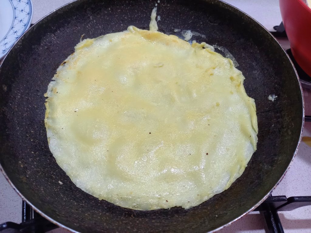 Drehen Sie die Crêpe um und kochen Sie sie noch eine Minute.
