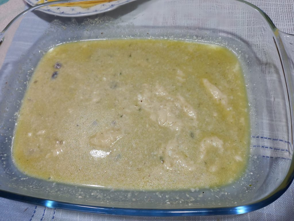Gießen Sie in die Backform eine Kelle Bechamel und die Flüssigkeit, die Sie aus dem Spargel abgetropft haben, und mischen Sie sie gleichmäßig.