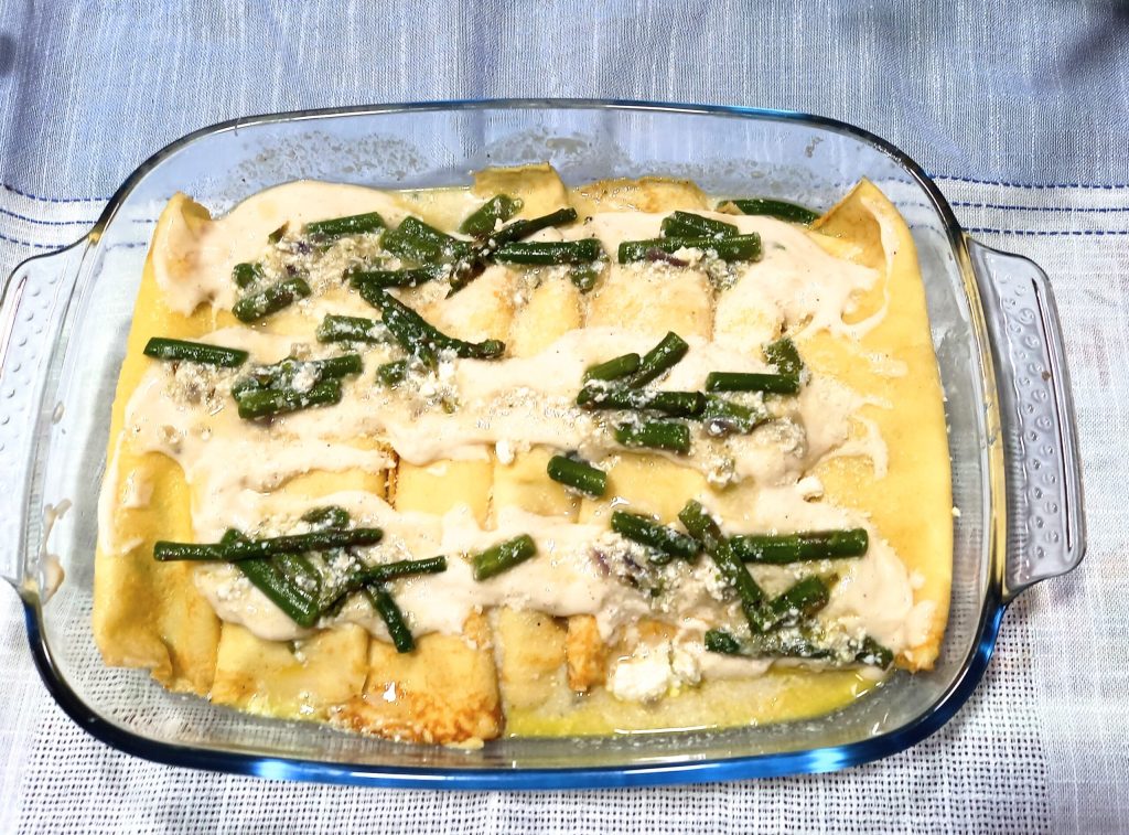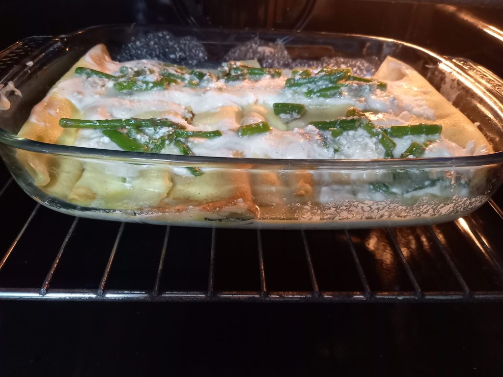 Köstliches Gericht mit zartem Geschmack, aber gleichzeitig nahrhaft. Der kräftige Geschmack des Spargels trifft auf die Zartheit und Leichtigkeit des Ricotta, alles umhüllt von den Crêpes, die dann mit Bechamel. bedeckt werden