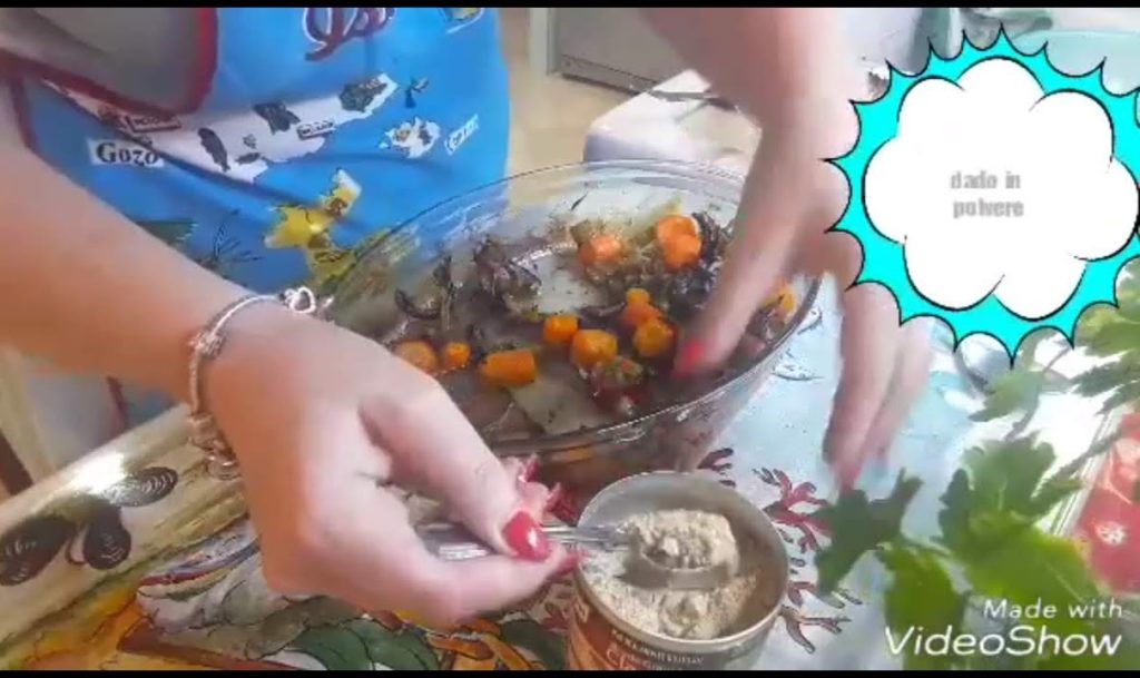 Verteile die Scheiben, die Pilze und deren Sauce in der Ofenform, die du zuvor zum Garen des Gemüses verwendet hast, und gieße die erhaltene Sauce darüber.