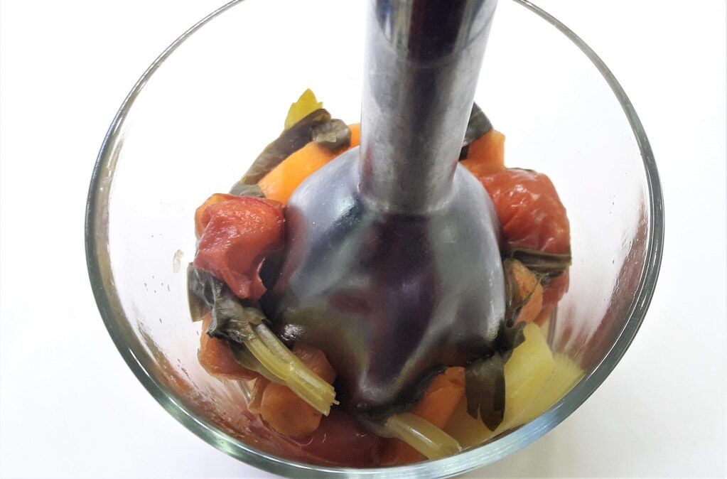 • Am Ende, wenn die Garzeit abgeschlossen ist, nehmen Sie das Gemüse mit einem Schaumlöffel heraus, geben Sie es in eine Glasschüssel und pürieren Sie es.