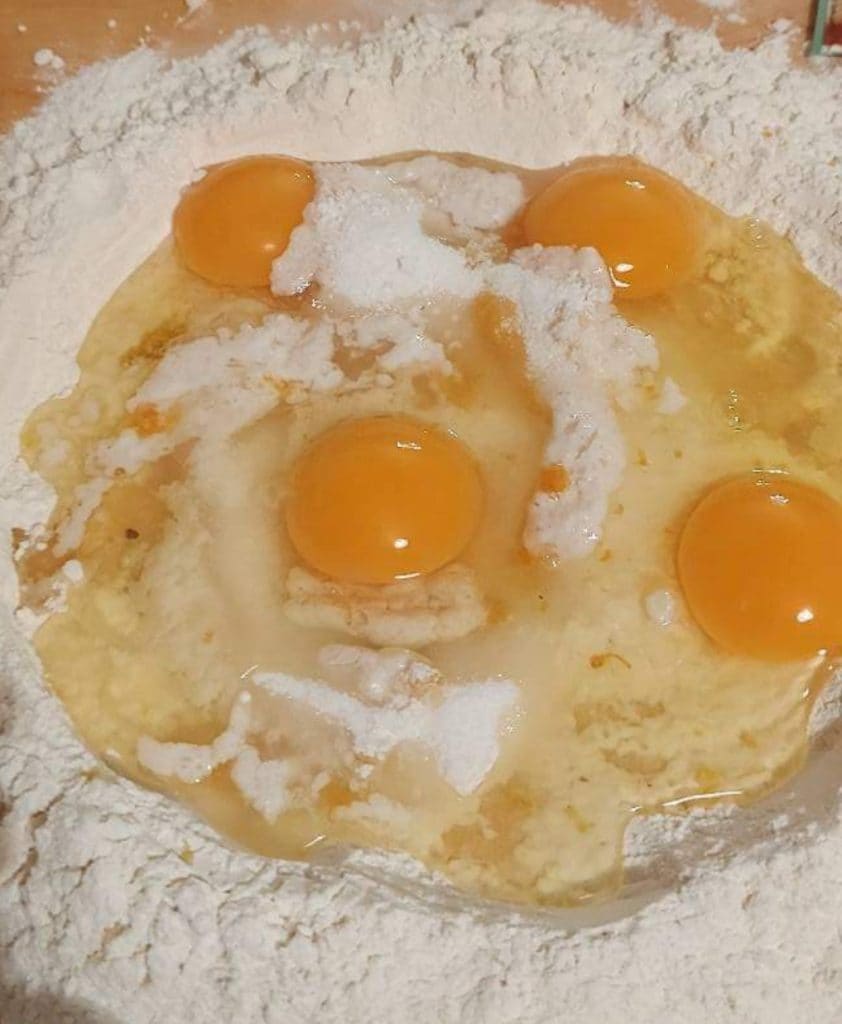 • Das Mehl in einem Brunnen anordnen und die Eier hineingeben
