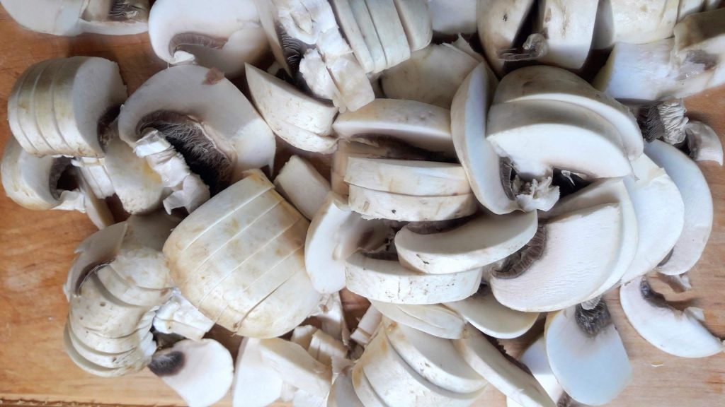 schneide die frischen Pilze.