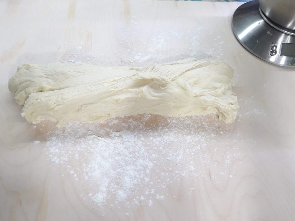 • Bestäube eine Arbeitsfläche mit etwas Mehl und forme den Teig vorsichtig zu einem „Quader“.