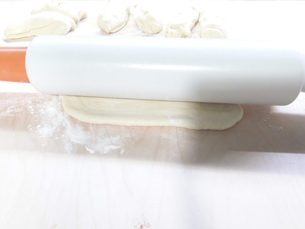 • Schneide den Teig in Stücke von ca. 100 g, dann rolle sie mit einem Nudelholz aus, ohne zu stark zu drücken.