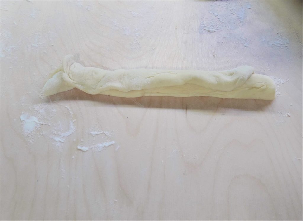 • Rolle den Teig dann von der schmalen Seite aus auf.