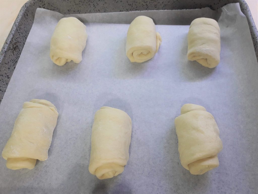 • Mach aus jedem zwei Stücke, rolle sie auf und stelle sie aufrecht auf das Backblech mit Backpapier.