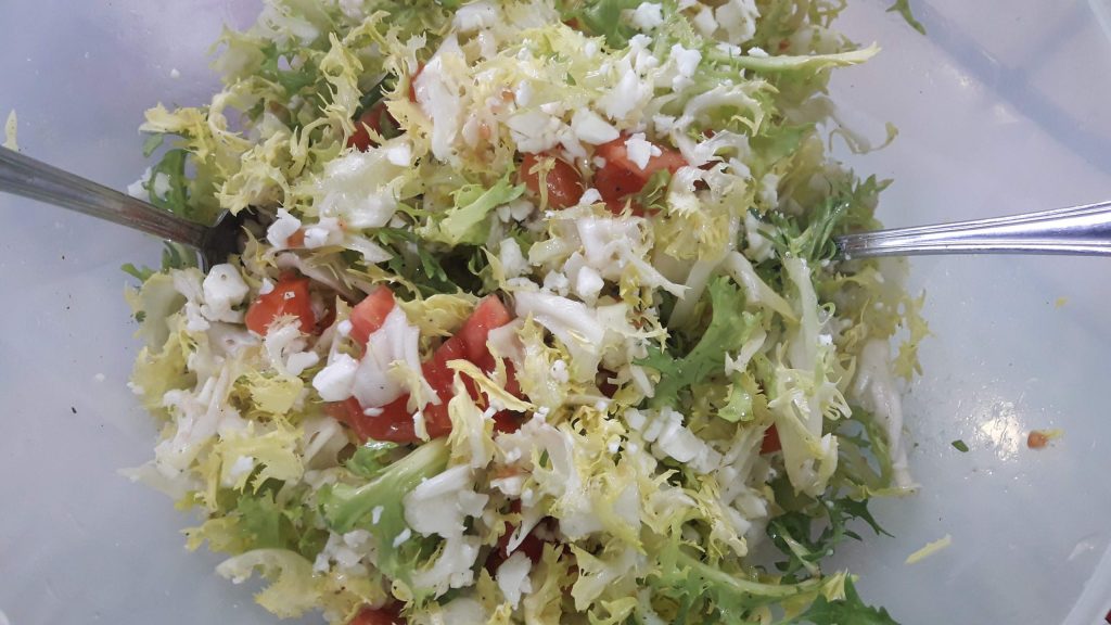 In einer Schüssel die Endivie mit den Tomaten und den in Stückchen geschnittenen Anchovis, den zerkleinerten Tuma und wie ein großer Salat würzen, mit Salz, Pfeffer, wenig Öl und Oregano, alles gut vermischen.