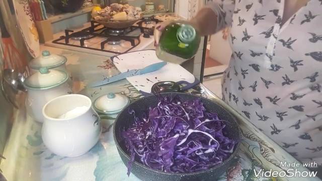 Beginnen wir mit der Zubereitung, indem wir die Zwiebel und den Kohl in Julienne-Streifen schneiden.