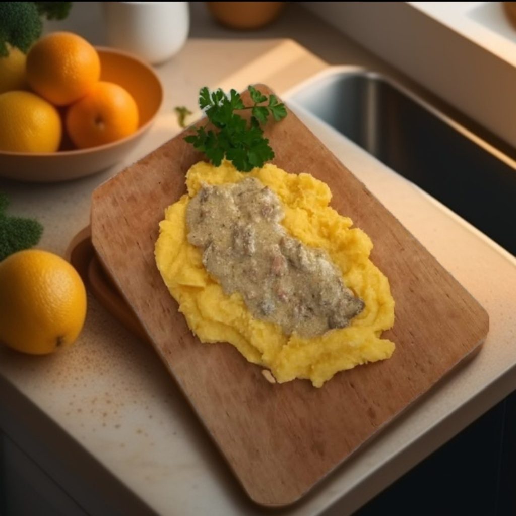 Polenta mit Pilzcreme und Speck. Ein typisches Wintergericht aus den Regionen Norditaliens und darüber hinaus.