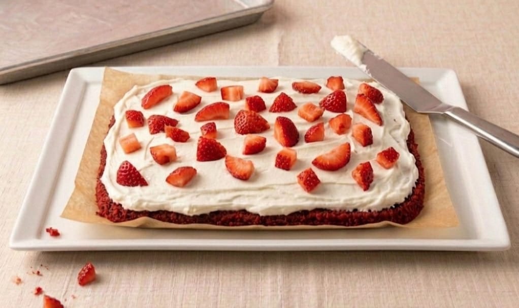 Schritte Red-Velvet-Rolle mit Creme und Erdbeeren