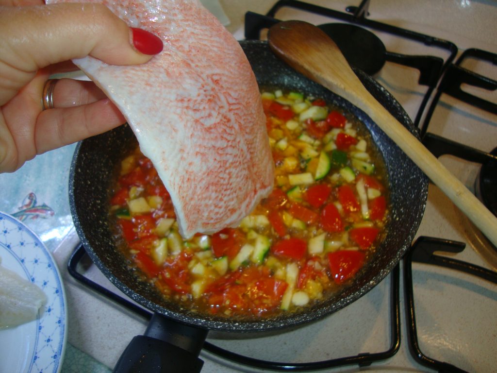 • Sobald die Zeit verstrichen ist, können Sie die restlichen Zucchinistücke hinzufügen, rühren und die Rotbarschfilets hinzufügen.