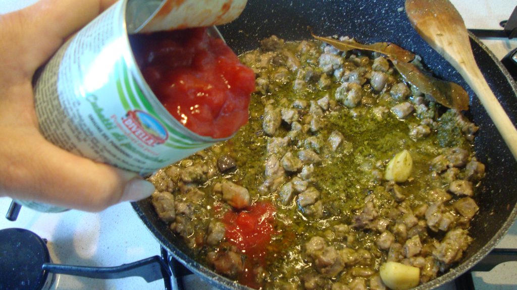 • Wenn der gehackte Thunfisch weiß geworden ist, lösche mit Weißwein ab, erhöhe die Hitze und lasse den gesamten Alkohol verdampfen.