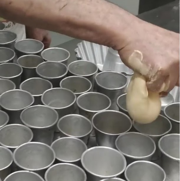 • Nach dem Gehen die Förmchen einfetten und die Formen mit etwa 50/60 g füllen.