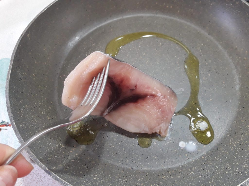 Stelle die Pfanne auf den Herd, mit 1 Esslöffel Olivenöl extra vergine, erhitze sie und brate jede Scheibe Schwertfisch für etwa 30 Sekunden pro Seite an. Dann stelle sie beiseite, ohne das Öl wegzuschütten.