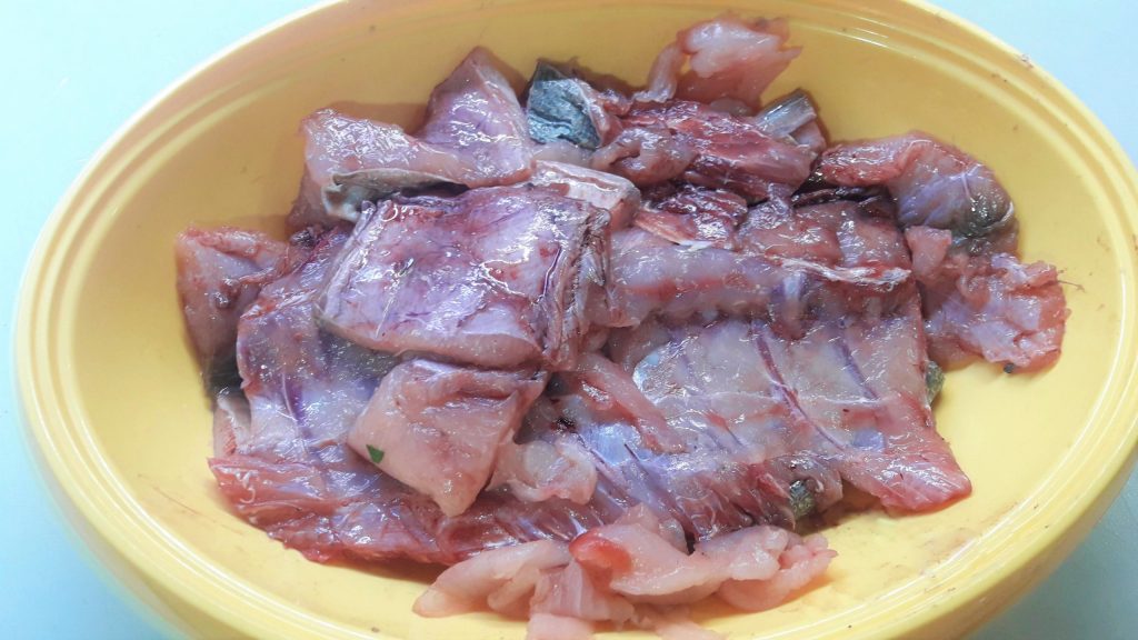 Jetzt bereiten wir die Brühe mit den „Abfällen“ des Fisches, also Gräten und Kopf, zu.