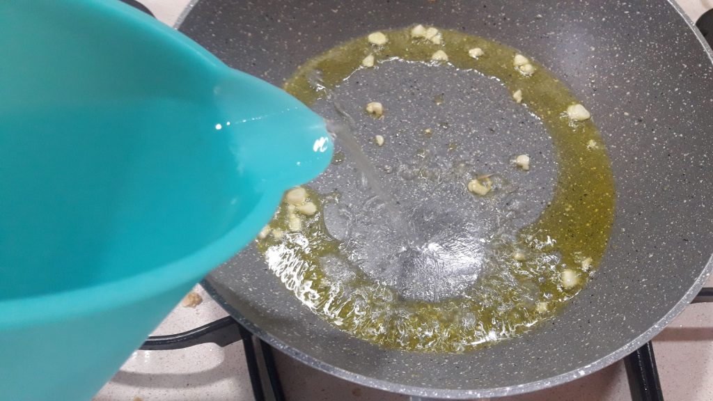 In derselben Pfanne, in der Sie die Spieße gebraten haben, fügen Sie weiteres Olivenöl extra vergine hinzu und 2 gehackte Knoblauchzehen. Lassen Sie es 2 Minuten anbraten, dann gießen Sie etwa 1 Liter Wasser darüber.