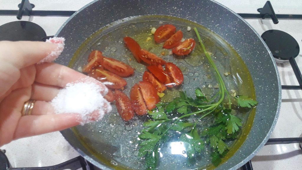 Fügen Sie dem Sud die in Stücke geschnittenen Kirschtomaten, einen Zweig Petersilie und eine Prise Salz hinzu. Decken Sie es ab und lassen Sie es etwa 16 Minuten kochen.