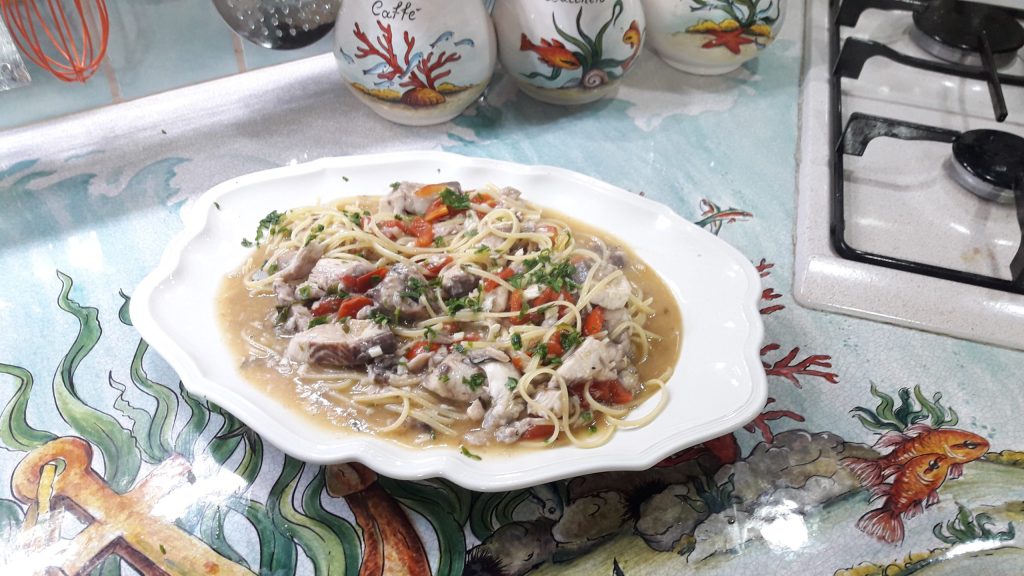 Hier sind die Linguine und die sizilianischen Goldmakrelen- oder Kaponen-Röllchen bereit