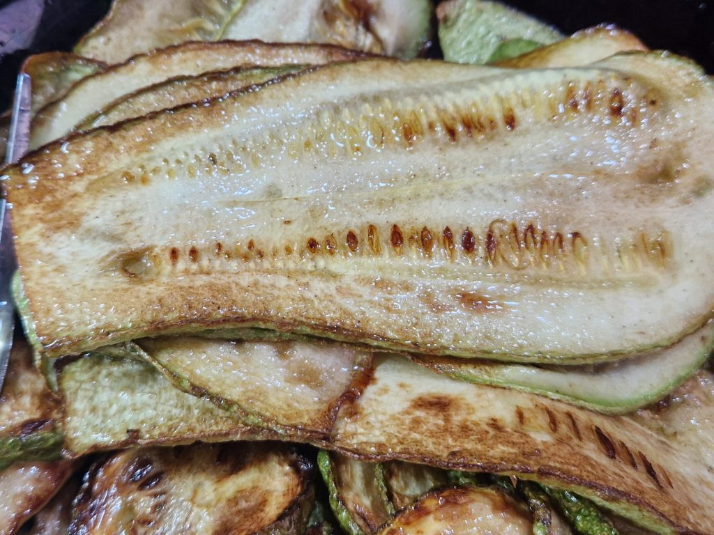 Wir beginnen mit den Zucchini, die je nach Geschmack frittiert oder gegrillt oder im Ofen oder in der Heißluftfritteuse mit etwas Öl gegart werden können.