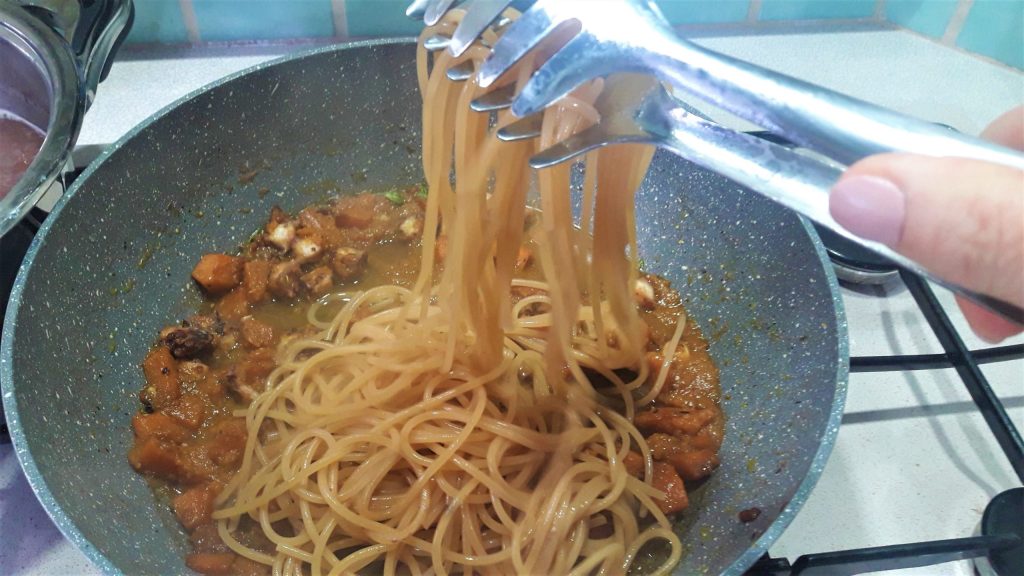 Zubereitung der Spaghetti mit Kürbis und geröstetem Oktopus