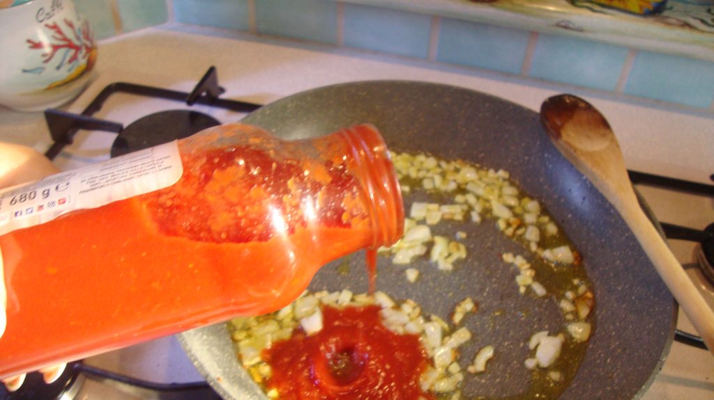 • Sobald die Zwiebel leicht gebräunt ist, füge die Tomatenpassata hinzu und lasse sie sanft 5 Minuten köcheln. Würze mit Salz und Pfeffer und füge bei Bedarf eine Prise Zucker hinzu.
