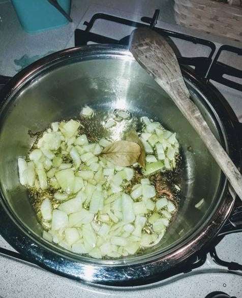 Jetzt bereiten wir die Soße vor: In einen Topf geben Sie das Olivenöl, 1 Lorbeerblatt und die in Stücke geschnittene Zwiebel.