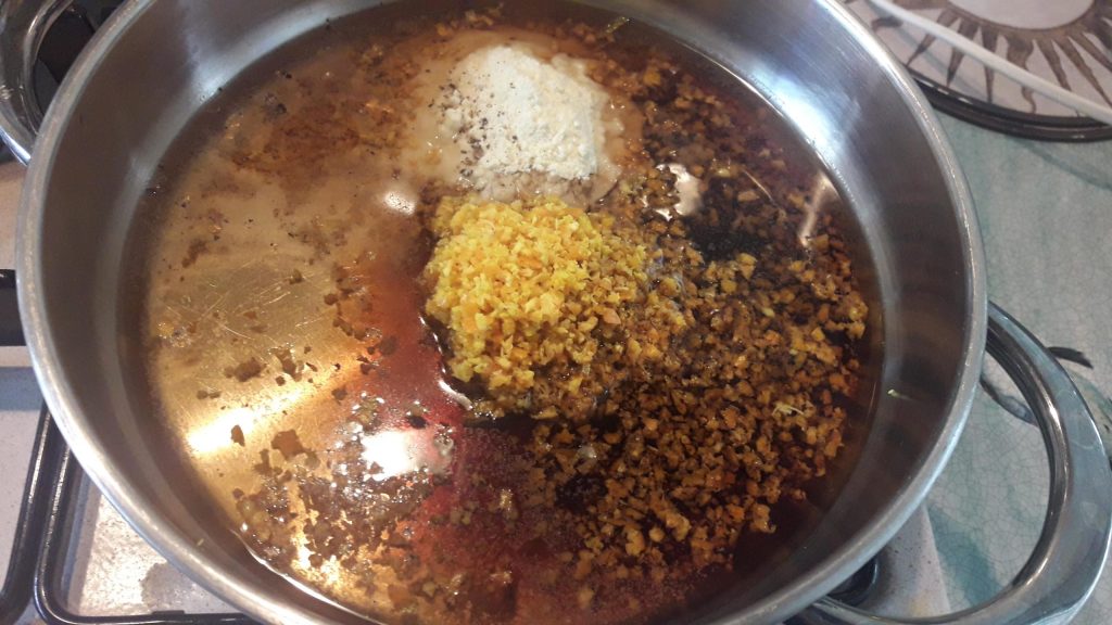 In einem kleinen Topf die Mehl, Soja, die gehackte Mandarinen-Schale, eine Prise Pfeffer hinzufügen.
