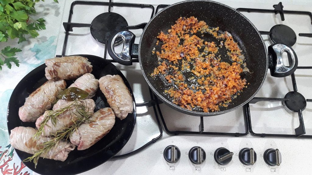 • In derselben Pfanne, ohne sie zu waschen, fügen Sie weiteres Öl hinzu und hacken die Zwiebel und die Karotten fein, und lassen sie 2 Minuten anbraten, dabei umrühren.