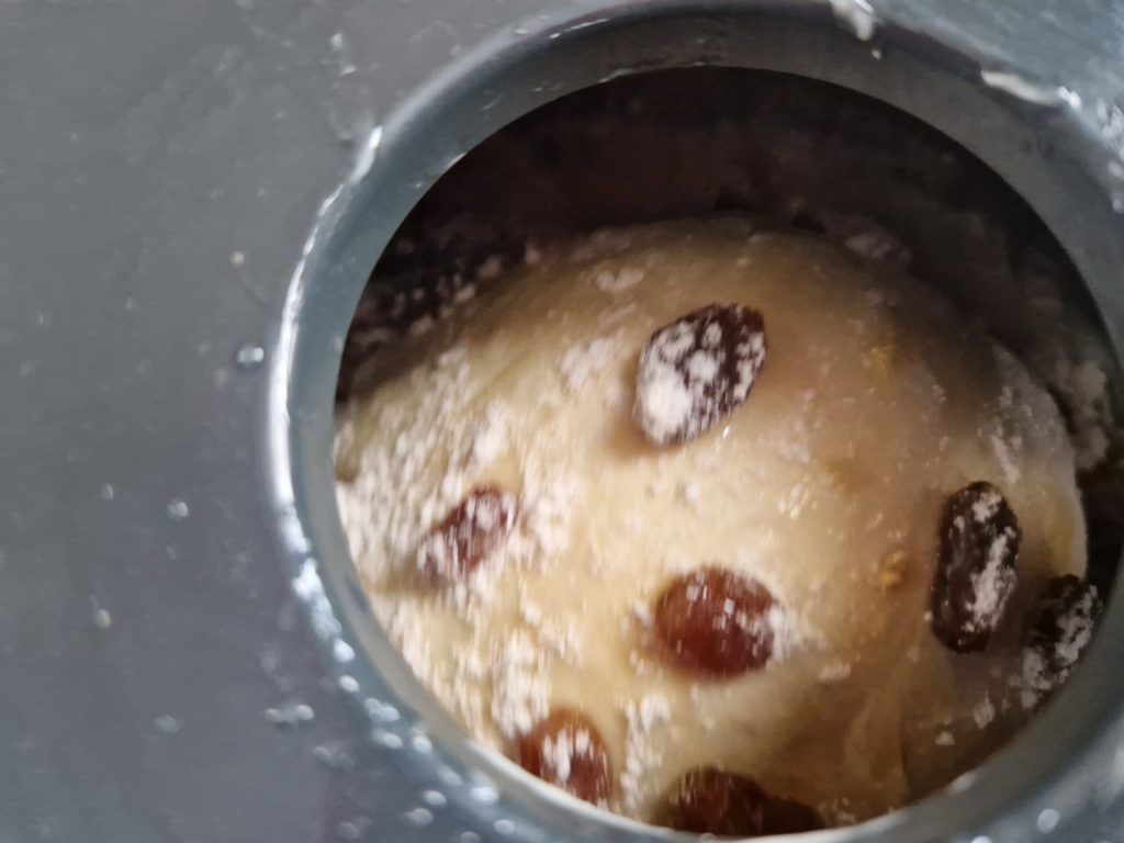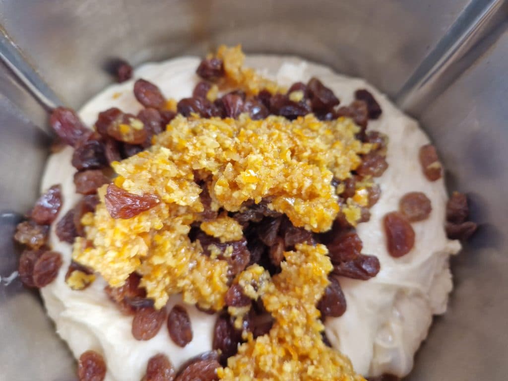 • Nach dem Aufgehen des Teigs die Rosinen und die zuvor vorbereiteten Aromen hinzufügen und erneut 3 Minuten auf Knetstufe durchkneten.