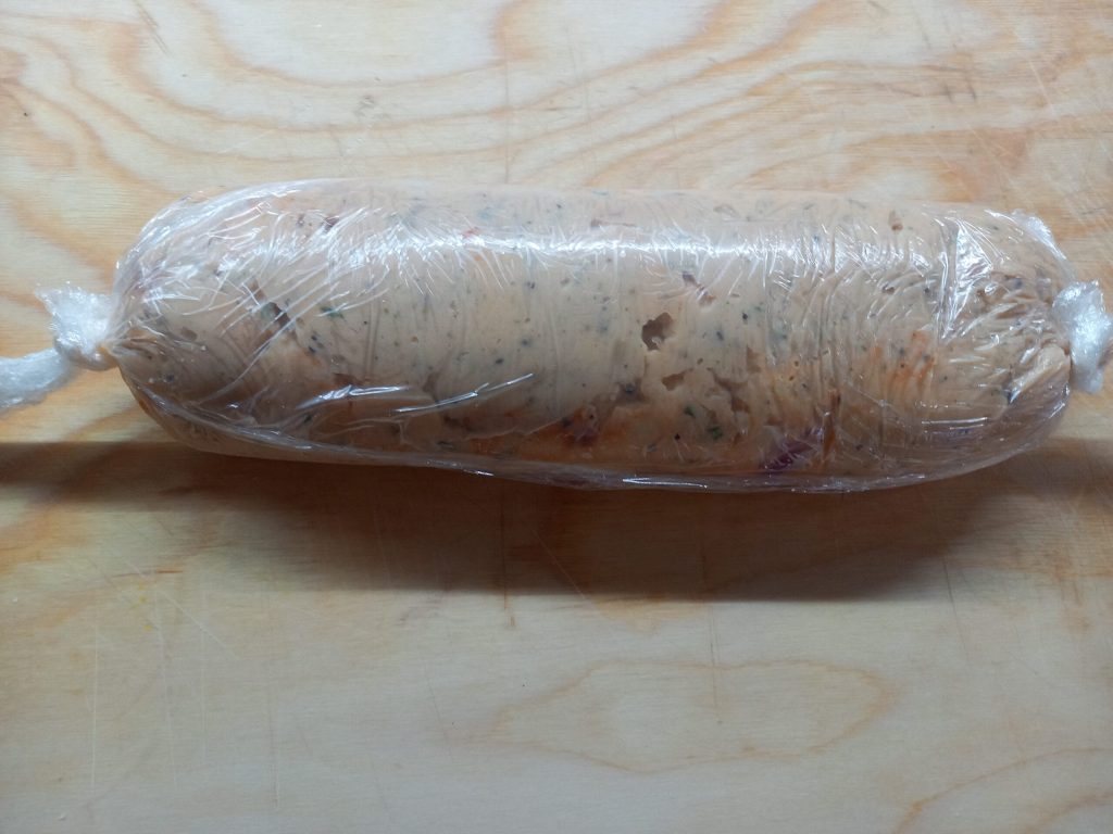 Jetzt den Rollbraten mit Hilfe der Folie aufrollen und die Enden wie eine Bonbonverpackung drehen. Den Kartoffelrollbraten auf einen Teller legen und 30 Minuten im Gefrierfach oder 2 Stunden im Kühlschrank aufbewahren.