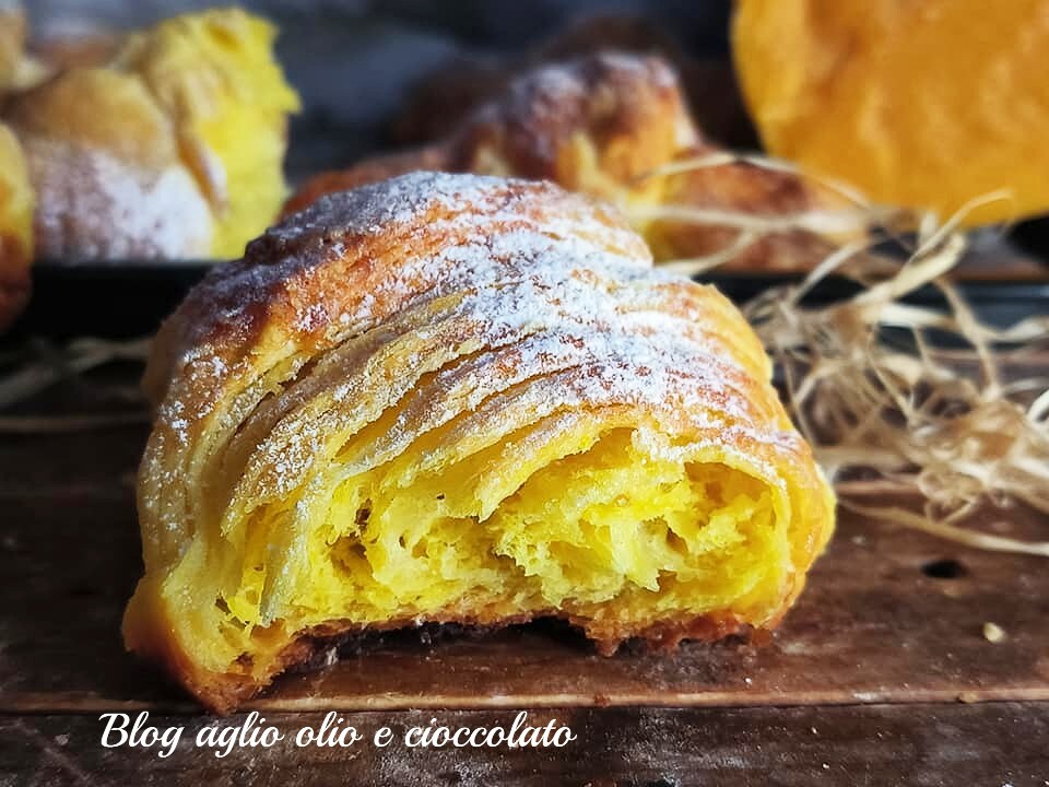 Sobald der Vorteig fertig ist, gebt ihn in die Schüssel der Küchenmaschine, fügt die Milch, den Zucker und das Mehl in drei Schritten hinzu, dann den gekochten und pürierten Kürbis, das Aroma und den Rest des Mehls und schließlich die weiche Butter. Der Teig könnte sehr feucht werden, wegen des Wassers im Kürbis, also fügt noch etwas Mehl hinzu, bis er schön weich ist, aber übertreibt es nicht. Lasst ihn gehen, bis sich das Volumen verdoppelt hat. In der Zwischenzeit die Butter zwischen zwei Backpapierblättern ausrollen und im Kühlschrank aufbewahren, bis sie verwendet wird. Sobald der Teig fertig ist, ausrollen und ein Rechteck formen, die Butter in die Mitte legen und zuerst die linke Seite darüberklappen und dann die rechte Seite darauflegen, mit einem Nudelholz ausrollen, ein großes Rechteck formen und wieder zuerst die linke Seite darüberklappen und dann die rechte Seite darüberlegen. Lasst es 30 Minuten im Kühlschrank ruhen und wiederholt diesen Vorgang zwei weitere Male. Rollt den Teig mit einem Nudelholz aus und formt erneut ein großes Rechteck, das länger als breit und mindestens einen halben Zentimeter dick ist. Schneidet das Rechteck in der Breite in zwei Hälften, so dass zwei Rechtecke entstehen, schneidet aus diesen beiden Rechtecken viele Dreiecke, rollt jedes Dreieck aus und rollt es von der längeren Seite her auf, bis sich Croissants bilden. Legt sie auf ein mit Backpapier belegtes Backblech und lasst sie gehen, bis sich das Volumen verdoppelt hat. Sobald sie fertig sind, bestreicht die Oberfläche der Croissants mit dem Ei und backt sie bei 180 Grad etwa 25/30 Minuten lang, aber richtet euch immer nach eurem Ofen. Nehmt sie heraus und bestäubt sie mit Puderzucker