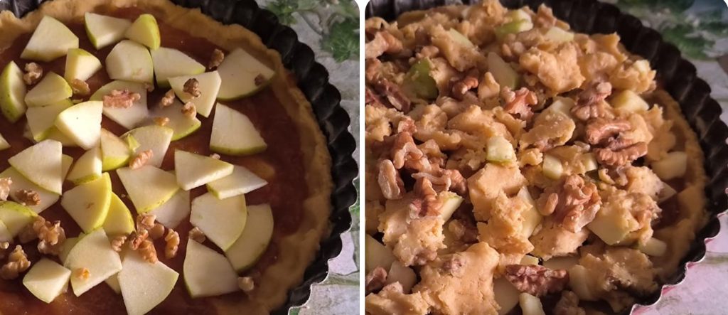 Zuerst machen wir den Mürbeteig. Geben Sie das Mehl als Brunnen auf die Arbeitsfläche, machen Sie ein Loch in der Mitte und fügen Sie alle Zutaten hinzu, kneten Sie gut und formen Sie einen schönen Teig. Teilen Sie den Teig in zwei Hälften, lassen Sie die eine Hälfte im Kühlschrank ruhen, während Sie die andere Hälfte mit den Händen ausbreiten und die Hälfte des Apfels in Würfel schneiden und mit der Schale und einem Großteil der Walnüsse verkneten, kneten Sie und bewahren Sie ihn 15 Minuten im Gefrierschrank auf. Rollen Sie die Hälfte des Teigs in einer gebutterten und bemehlten Tortenform aus, streichen Sie die Marmelade darauf und bedecken Sie es mit der anderen Hälfte des in Stücke geschnittenen Apfels und den restlichen Walnüssen und schließlich, bedecken Sie alles mit dem Teig, den Sie im Gefrierschrank haben, indem Sie ihn darüber bröckeln. Backen Sie bei 180 Grad für etwa 30 Minuten, aber passen Sie sich immer an Ihren Ofen an. Nehmen Sie ihn aus dem Ofen und bestreuen Sie ihn mit Puderzucker.