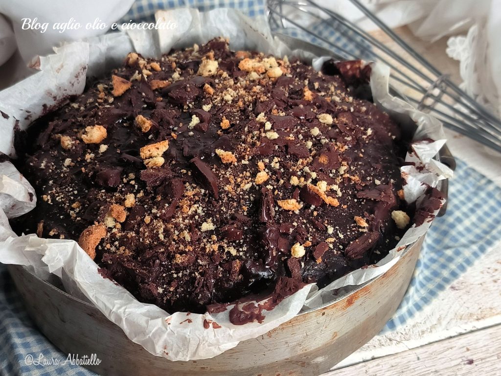 Wenn ihr euch für eine schnelle Glasur entscheidet, müsst ihr den Kakao in eine Schüssel geben und beginnen, Wasser hinzuzufügen. Ihr müsst eine dicke Konsistenz erreichen. Wenn ihr eine reichhaltige Glasur machen wollt, gebt alle Zutaten in einen kleinen Topf und lasst sie auf dem Herd eindicken. Sobald sie fertig ist, gießt sie über den Kuchen. Ich habe Stücke von Zartbitterschokolade und zerbröselte Kekse hinzugefügt, aber ihr könnt sie auch weglassen. Schneidet ein Stück ab und genießt diese super schokoladige Köstlichkeit.