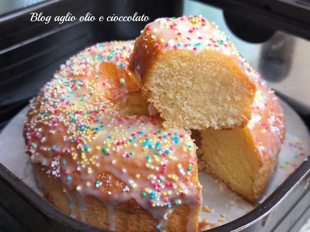 Um diesen wunderbaren Kuchen zu machen, könnt ihr entweder die elektrischen Rührbesen verwenden oder alles von Hand machen, wie man es früher gemacht hat. In einer Schüssel die Eier mit dem Zucker sehr gut aufschlagen, sie müssen schön fluffig sein, das Öl langsam hinzugeben und das Aroma hinzufügen, das Backpulver in die Milch geben und wenn es anfängt Blasen zu bilden, schnell umrühren, es bildet sich ein großer Schaum, alles sofort in die Schüssel geben und schnell mischen, zum Schluss das gesiebte Mehl mit dem Salz hinzufügen. Alles in eine etwa 25 cm große, gebutterte und bemehlte Kranzkuchenform geben und bei 180 Grad für etwa 35 Minuten backen, aber richtet euch immer nach eurem Ofen und macht die Stäbchenprobe. Aus dem Ofen nehmen und abkühlen lassen. In der Zwischenzeit die Glasur vorbereiten. In einer Schüssel etwas Puderzucker geben und nach und nach etwas Wasser hinzufügen, bis eine ziemlich dichte Konsistenz erreicht ist, alles über den Kranzkuchen gießen, mit den Zuckerstreuseln bedecken und mit Puderzucker bestäuben.