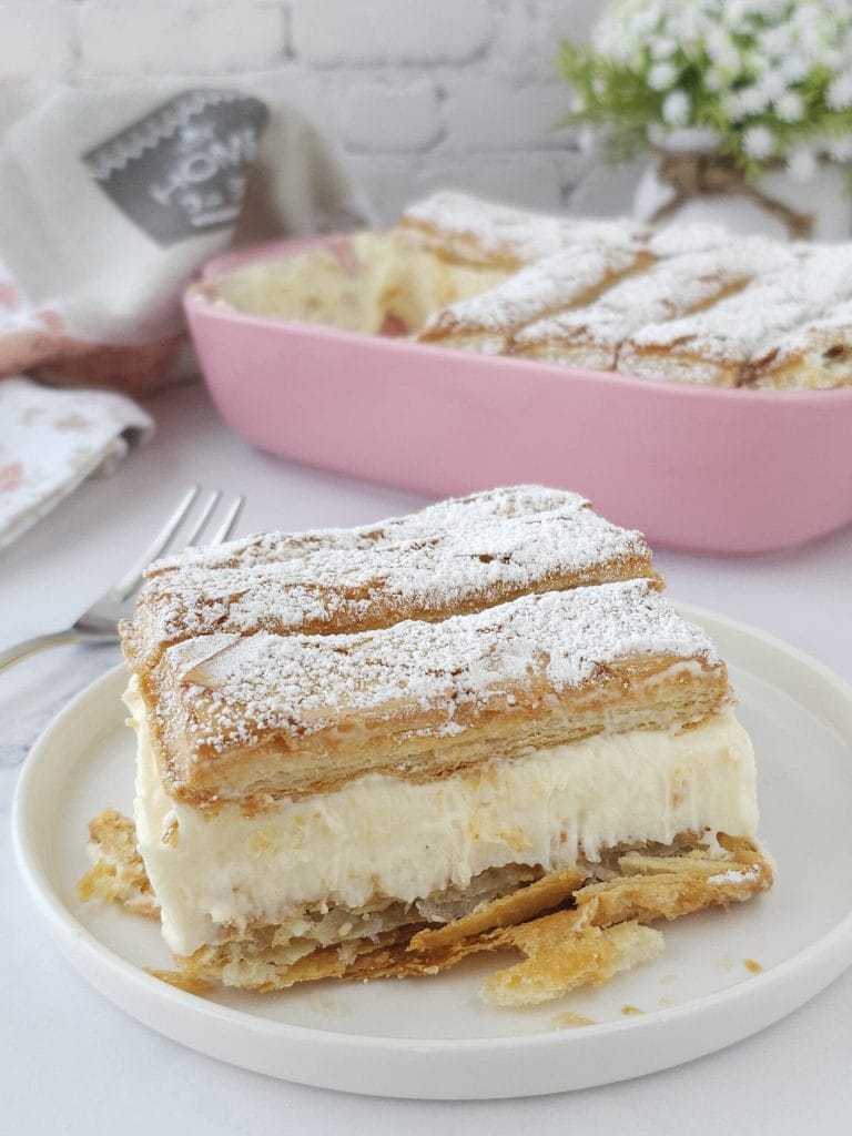Es ist ratsam, den Blätterteig am selben Tag oder besser 3-4 Stunden vor dem Servieren zuzubereiten und insbesondere zusammenzustellen, damit er noch knusprig und knackig ist, wenn er genossen wird. Wenn etwas übrig bleibt, im Kühlschrank aufbewahren.