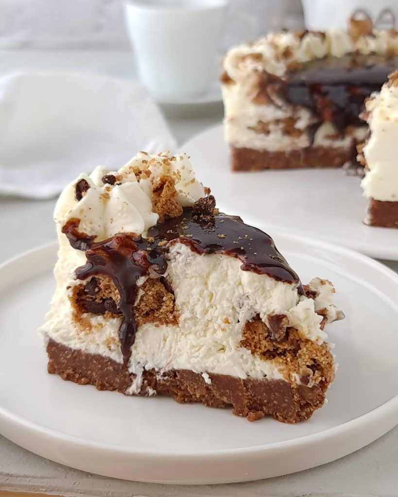 In einer großen Schüssel den kalten Mascarpone aus dem Kühlschrank, die kalte flüssige frische Sahne zusammen mit dem Puderzucker hinzufügen und mit den elektrischen Handrührern einige Minuten lang aufschlagen, bis eine schaumige und feste Masse entsteht. Die Springform aus dem Kühlschrank oder Gefrierschrank nehmen und die Hälfte der Masse darauf verteilen, die in zwei Hälften geschnittenen Cookies wie auf dem Foto darauf legen und die restliche Füllung hinzufügen. Die Oberfläche gut mit einem Löffel oder einer glatten Teigschaber glattstreichen und den Käsekuchen für ca. 3 Stunden im Gefrierschrank fest werden lassen. Den Kuchen aus dem Gefrierschrank nehmen und den Ring oder die Form mit Hilfe eines Haartrockners vorsichtig lösen, auch das Backpapier entfernen und den Kuchen auf einen Servierteller legen. Den Cheesecake für 1 Stunde im Kühlschrank auf Temperatur kommen lassen. In der Zwischenzeit die Schokoladenglasur vorbereiten. Die Milch in einem kleinen Topf erwärmen und dann die Zartbitterschokolade in Stücken hinzufügen und kräftig rühren, schließlich den Honig hinzufügen und 10-15 Minuten abkühlen lassen, dabei gelegentlich umrühren.