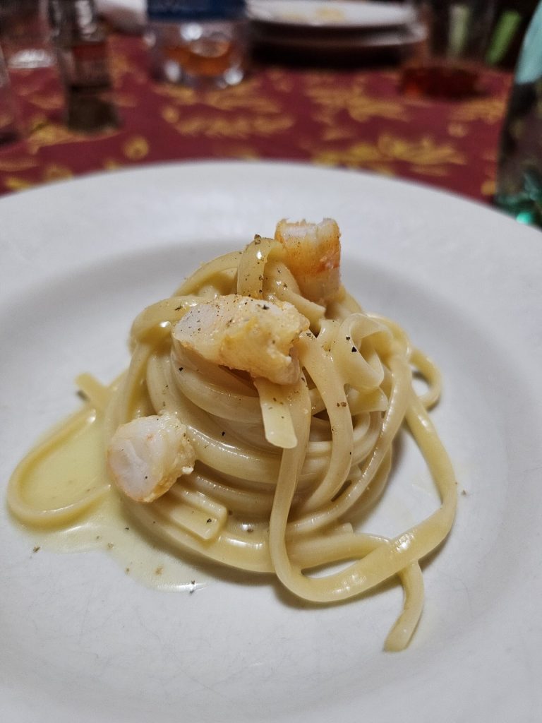 Die Zwiebel schälen und in zwei Hälften schneiden. Olivenöl extra vergine in einem großen Topf erhitzen und die Zwiebel hinzugeben und 5 Minuten anschwitzen lassen. Die Fischreste hinzugeben und bei mittlerer Hitze ein paar Minuten unter Rühren anrösten, damit der Fisch nicht anbrennt. Mit Weißwein ablöschen und sobald dieser verdampft ist, das Wasser hinzugeben. Schließlich Pfefferkörner, Petersilienblätter und Salz hinzugeben. Bei niedriger Hitze etwa 50 Minuten köcheln lassen. Bei Bedarf gelegentlich mit einem Schaumlöffel abschöpfen. Nach dem Kochen mit einem Sieb abseihen. Den Fischfond bei niedriger Hitze warm halten, da er zum Kochen der Pasta benötigt wird. Währenddessen die Garnelen in die Pfanne geben und für einige Minuten auf jeder Seite anbraten. Jetzt widmen wir uns der risottierten Pasta. In eine breite Pfanne das Öl und die Butter geben, ich habe es nach Gefühl gemacht, aber man benötigt eine gute Menge für diese Menge an Pasta. Dann erhitzen und die Butter mit dem Knoblauch schmelzen lassen, anschließend die rohen Linguine hinzufügen und nach und nach ein paar Kellen heißen Fischfond in die Pfanne geben, dabei ständig umrühren. Sobald die Flüssigkeit von der Pasta aufgenommen wurde, mehr hinzufügen, bis die Pasta auf den gewünschten Punkt gegart ist (oder al dente). Nachdem das Feuer ausgeschaltet ist, die Garnelen und ein wenig Öl hinzugeben und gut vermengen. Sofort anrichten und servieren. Ich hoffe, euch gefällt mein letztes Rezept, bis zum nächsten Mal, Freunde.
