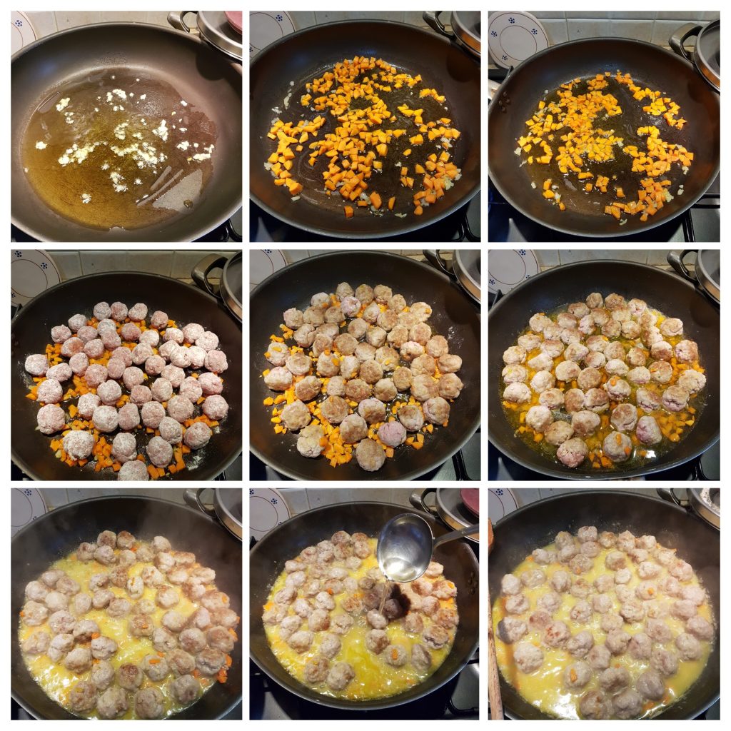 • In einer großen Pfanne das extra native Olivenöl und die gehackte Zwiebel hinzufügen und einige Minuten anbraten. Die Karotten hinzufügen und weitere 5 Minuten anbraten. Die Frikadellen dazugeben und einige Minuten auf beiden Seiten anbraten, um das Fleisch gut zu versiegeln. Sobald die Kruste sichtbar wird, mit Weißwein ablöschen und verdampfen lassen. Mit Salz und Pfeffer abschmecken und beginnen, die Frikadellen unter gelegentlichem Zugießen der Brühe zu garen. Mit einem Deckel etwa 30 Minuten oder bis die Frikadellen weich sind und sich eine Cremigkeit bildet, garen.