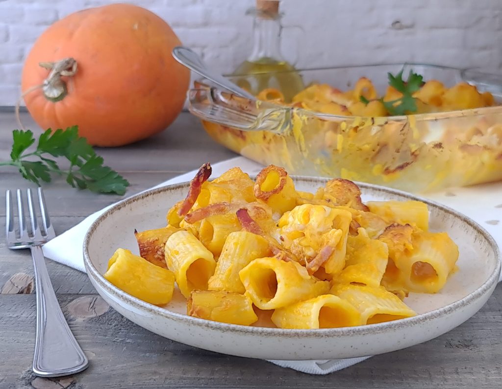 In einer Kasserolle die gewünschte Pastaform in kochendem Salzwasser garen, ich habe Mezzi Rigatoni verwendet. Die Pasta sehr al dente abgießen und mit einem Sieb unter dem kalten Wasserstrahl der Wasserleitung abkühlen. In eine Schüssel die Pasta, die Kürbiscreme und den Speck geben und gut vermengen. Die Pasta in eine Auflaufform geben und den geriebenen Käse sowie den gewürfelten Mozzarella hinzufügen und vermengen. Zum Schluss eine weitere Prise Käse hinzufügen und bei 180° ca. 20 Minuten oder bis sie goldbraun sind, backen. Abschalten, einige Minuten abkühlen lassen und dann servieren.