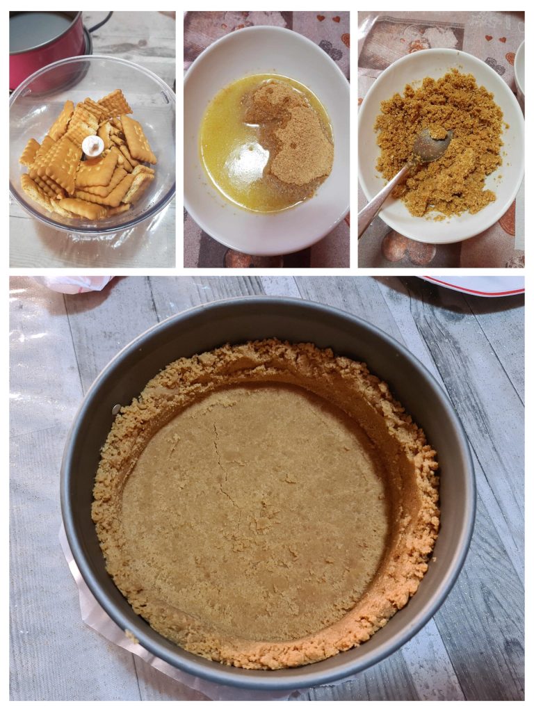 Um diesen gebackenen Pfirsich-Käsekuchen zu machen, muss zuerst der Boden vorbereitet werden. In einem kleinen Topf die Butter schmelzen. Sie können sie auch in der Mikrowelle schmelzen. In einem Mixer die Kekse fein zerkleinern. Die Butter über die Kekse gießen und gut andrücken, indem alles in eine zuvor mit Backpapier ausgelegte 20 cm Springform gelegt wird. Mit der Rückseite eines Löffels sowohl den Boden als auch die Seiten gut glattstreichen, um eine Schale zu formen, und 20 Minuten im Gefrierschrank fest werden lassen.