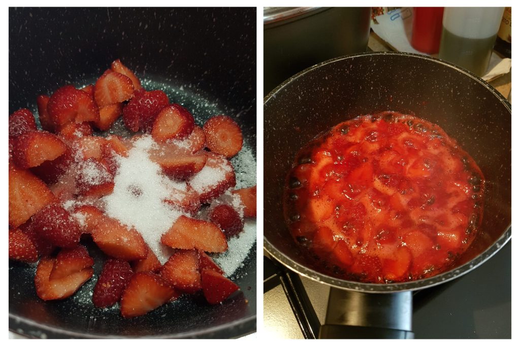 • In einem kleinen Topf die in Würfel geschnittenen Erdbeeren zusammen mit dem Zitronensaft und dem Kristallzucker geben und einige Minuten unter gelegentlichem Rühren kochen. Wenn die Erdbeeren weich sind, ausschalten und abkühlen lassen.