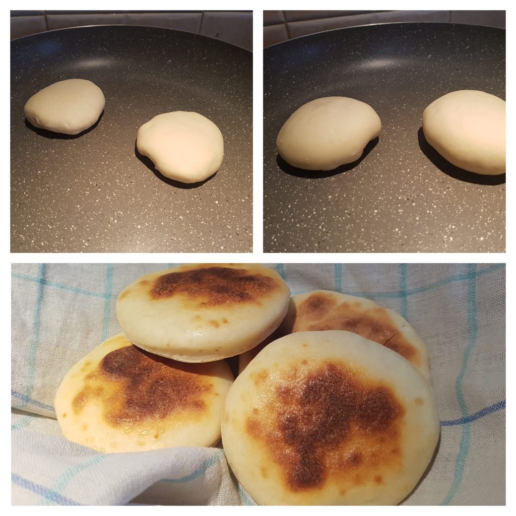Eine Pfanne leicht einölen und das überschüssige Öl mit einem Küchentuch entfernen, die Pfanne stark erhitzen und die Brötchen hineinlegen. Mit Deckel auf beiden Seiten kochen, es dauert 8-10 Minuten pro Seite bei mittlerer bis niedriger Hitze. Wenn die Brötchen fertig sind, in einen mit einem Geschirrtuch ausgelegten Korb legen und warm halten.
