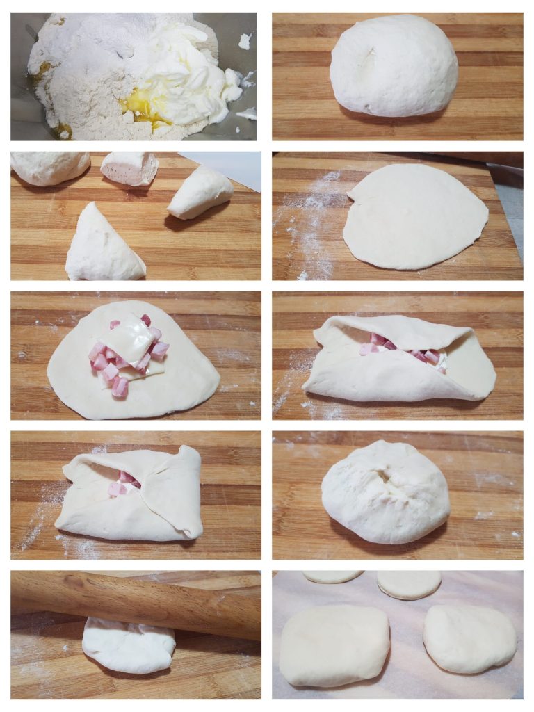 Um diese leckeren gefüllten Brötchen herzustellen, muss man zunächst den griechischen Joghurt aus dem Kühlschrank nehmen und ihn 10-15 Minuten bei Raumtemperatur stehen lassen. Alle Zutaten in einer Schüssel zu einem glatten und homogenen Teig verkneten. Sie können eine Küchenmaschine verwenden oder alles von Hand kneten. Sobald der Teig fertig ist, 10 Minuten ruhen lassen. Dann den Teig in etwa 6-8 Portionen teilen (natürlich abhängig von der gewünschten Größe) und Kugeln formen. Jede einzelne Portion mit einem Nudelholz dünn ausrollen, mit Speckwürfeln und einer Schmelzkäse-Scheibe füllen (heute hatte ich diese Zutaten zu Hause) oder Sie können jede beliebige Füllung verwenden, die Sie bevorzugen. Die Ränder des Teiges anheben und in der Mitte zusammendrücken, um die Brötchen zu verschließen. Auf allen Seiten wiederholen, um ein gut verschlossenes Päckchen zu erhalten. Mit einem Nudelholz leicht flachdrücken.