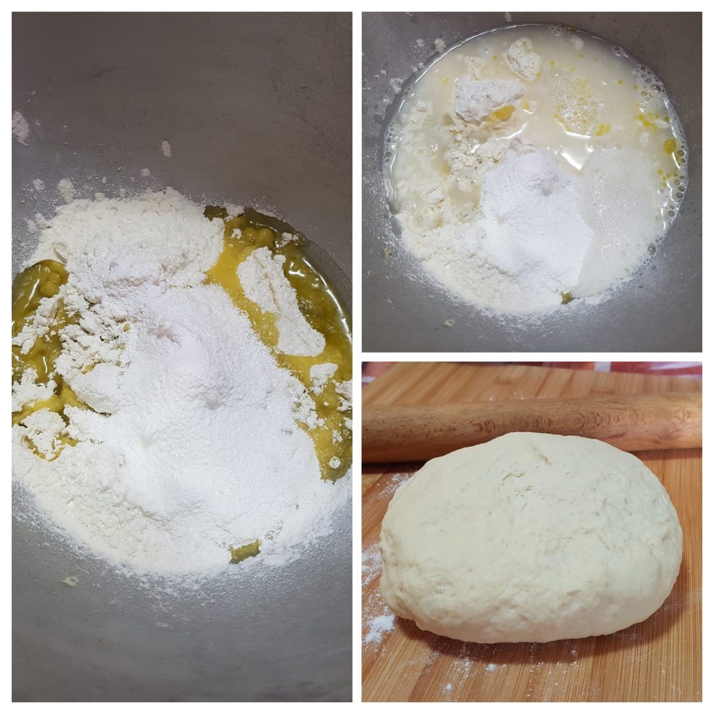 Um diese gefüllte Pfannenfocaccia zuzubereiten, muss zunächst der Teig vorbereitet werden. Ihr könnt alles von Hand in einer Schüssel kneten oder jede beliebige Küchenmaschine verwenden. Aus Bequemlichkeit habe ich die Küchenmaschine verwendet. Gebt in die Schüssel der Küchenmaschine alle Zutaten und knetet mit dem K-Haken ein paar Minuten auf Stufe 2, bis ein glatter und homogener Teig entsteht. Lasst den Teig 10 Minuten bei Raumtemperatur abgedeckt mit einer Schüssel ruhen.