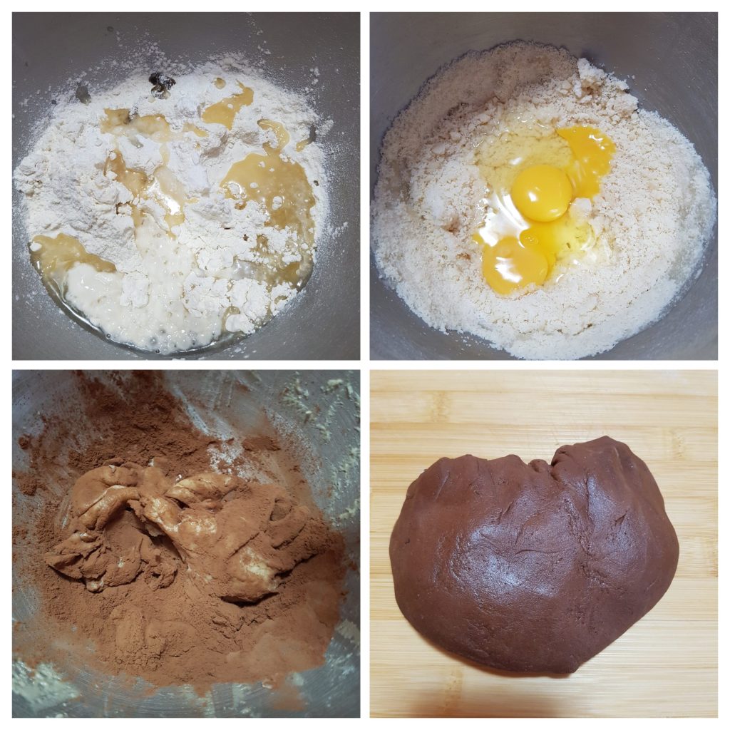 In die Schüssel der Küchenmaschine geben und mit dem Flachrührer (K) den Zucker, das Mehl 00, das ungesüßte Kakaopulver, das Salz, die beiden Triebmittel, das Sonnenblumenöl hinzufügen und einige Minuten bei mittlerer Geschwindigkeit kneten. Die Milch, das Ei, die Vanilleessenz hinzufügen und noch einige Minuten mischen, bis ein glatter und homogener Teig entsteht. Bei Bedarf mehr Mehl 00 hinzufügen, wenn der Teig zu weich ist. Den Mürbeteig auf einer Arbeitsfläche gut zusammenkneten, eine Kugel formen und in Frischhaltefolie wickeln und 10 Minuten bei Raumtemperatur ruhen lassen. Wenn ihr keine Küchenmaschine habt, könnt ihr den Mürbeteig auch in einer Schüssel von Hand kneten.