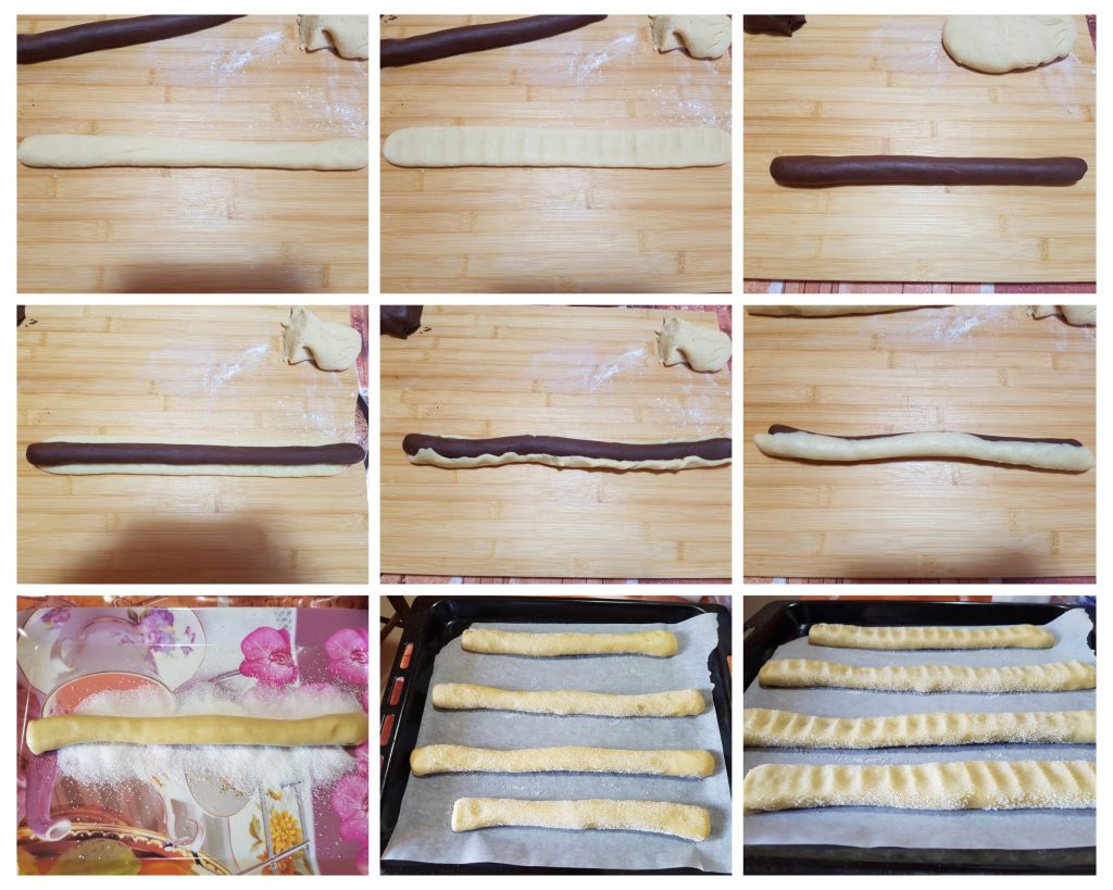 Nehmt einen Teil des weißen Teigs und formt einen Laib, leicht mit den Händen zusammendrücken und in der Zwischenzeit einen Teil des Kakaoteigs nehmen und einen etwas dünneren Laib als den weißen formen. Den Kakaoteig auf den weißen legen und wie auf dem Foto zu sehen ist, mit den Händen zu einem nahezu einheitlichen Teig rollen. Auf ein Tablett Zucker streuen und den zweifarbigen Laib gut im Zucker wälzen. Den Laib auf ein mit Backpapier ausgelegtes Backblech legen und mit dem Rest der Teige fortsetzen. Ich persönlich habe 4 Laibe erhalten. Sie sollten nicht zu lang sein, da sie sonst nicht auf das Blech passen. Leicht mit den Händen zusammendrücken und im vorgeheizten statischen Ofen bei 180° 15-20 Minuten oder bis die Oberfläche goldbraun ist, backen.
